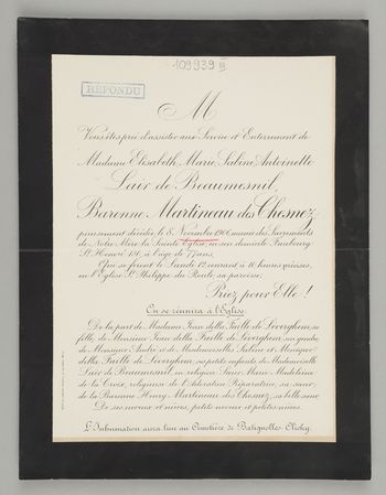 Zawiadomienie o pogrzebie na cmentarzu Batignolles-Clichy.