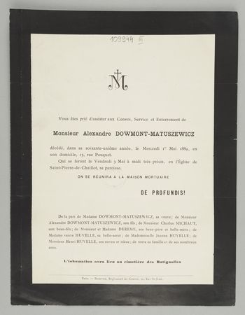 Zawiadomienie o pogrzebie na cmentarzu Batignolles.