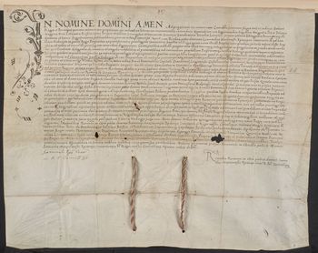 Na odwrocie: streszczenie [XVI w.]; "Jura praepositi s. Hedvigis"; "Mercurii 11 maii 1644 productum et decretum ut in actis Episcopatus Cracoviensis"; "Fascic. 59, No 521"; "25"; "Ex Scatula 17, Jura praepositi s. Hedvigis"; "F 59, No 212 generale"; "B ad Numerum consignationis 1-mum. "N 9"; "No 987/162" [przekreślone]; "Ad A" [przekreślone]; inne noty zatarte.