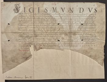 Pieczęci króla Zygmunta III brak, dokument oberwany u dołu.