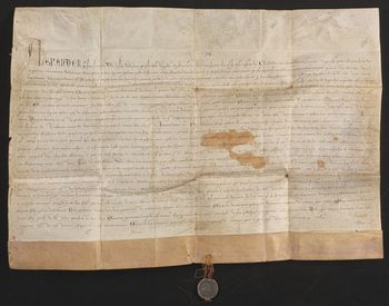 Bulla ołowiana papieża Aleksandra IV zawieszona na czerwono-złotych jedwabnych niciach.