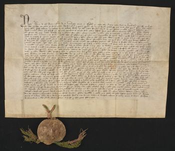 Pieczęć dwustronna króla Jana Luksemburskiego zawieszona na zielono-różowych jedwabnych niciach.