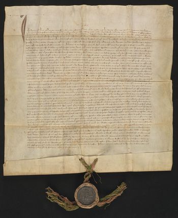 Pieczęć wielkiego mistrza Ludera księcia brunszwickiego zawieszona na różowo-zielonych jedwabnych niciach.