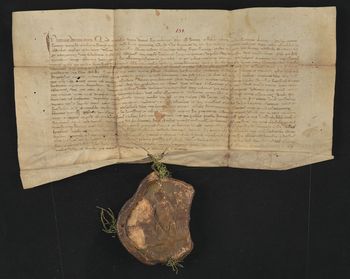 Pieczęć majestatyczna króla Kazimierza Wielkiego zawieszona na zielonych niciach [w znacznym stopniu uszkodzona] (M. Gumowski, Pieczęcie królów nr 6a, Fr. Piekosiński, Pieczęcie nr 377).