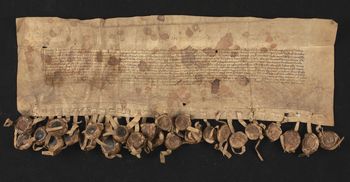 27 pieczęci szlacheckich zawieszonych na paskach pergaminowych, trzech pieczęci brak, pozostał po nich pergaminowy pasek i nacięcia.
