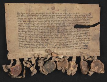 Z trzynastu pieczęci zawieszonych na pergaminowych paskach pozostało pięć [zatartych], miska po jednej pieczęci i siedem pasków pergaminowych.