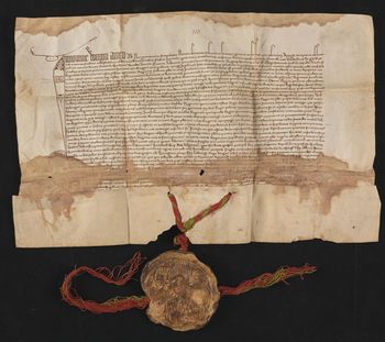 Pieczęć majestatyczna króla Władysława Jagiełły zawieszona na czerwono-zielonych niciach [nieco uszkodzona], jako contrasigillum wytłoczona pieczęć średnia kancelaryjna króla (M. Gumowski, Pieczęcie królów nr 13 i nr 15).