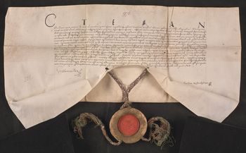 Pieczęć króla Stefana Batorego zawieszona na jedwabnym kolorowym sznurku.