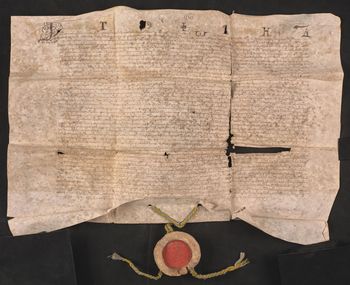 Pieczęć króla Stefana Batorego zawieszona na jedwabnym kolorowym sznurku.