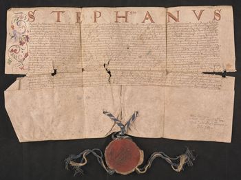 Pieczęć dwustronna króla Stefana Batorego zawieszona na jedwabnym biało-niebieskim sznurku (M. Gumowski, Pieczęcie królów nr 63 i 67). Miseczka odłamana.