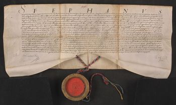 Pieczęć króla Stefana Batorego zawieszona na jedwabnym kolorowym sznurku.