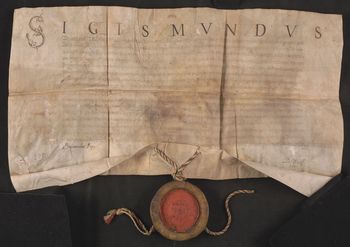 Pieczęć króla Zygmunta III zawieszona na jedwabnym kolorowym sznurku (Gumowski, Pieczecie nr 74).