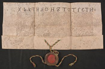Pieczęć króla Zygmunta III zawieszona na jedwabnym kolorowym sznurku, we fragmencie uszczerbiona.