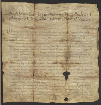 Na odwrocie: "F. 10. N. 1. Zakrzówek"; "Niniejszy przywilej sprawiedliwie pozwolony i dany I. Panu Franciszkowi Kochańskiemu od J. W. J. X. Eugeniego Konarzewskiego opata koprzywnickiego i od J. W. Sukcesora Krzysztofa Bogorii Skotnickiego z całym Zgromadzeniem Koprzywnickim podpisany, aprobujemy i zatwierdzamy mocą wizytatorską. Dat. w Koprzywnicy podczas regularnej wizytacji; Dnia 7 maja R. P. 1776, Ks. Floryan Gotartowski Opat Pelpliński i Cysterski przez Polskę etc. Komisarz i Wizytator Generalny". "N 11"; "Ad 2732/797"; "Nota o oblatowaniu dokumentu w aktach grodzkich lubelskich 30 I 1769 r.".