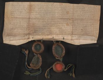 Cztery pieczęcie przywieszone po dwie, jedna pod drugą, na kolorowych sznurkach, jedna ułamana, w pozostałych otoki nieczytelne. 1. Bogumiły Siemikowskiej ksieni, 2. i 3. klasztoru w Ołoboku, 4. Elżbiety Ciemieńskiej ksieni.