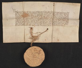 Pieczęć majestatyczna króla Władysłąwa Jagiełły [mocno zatarta] zawieszona na czerwonym jedwabnym sznurku (M. Gumowski, Pieczęcie królów, nr 13).