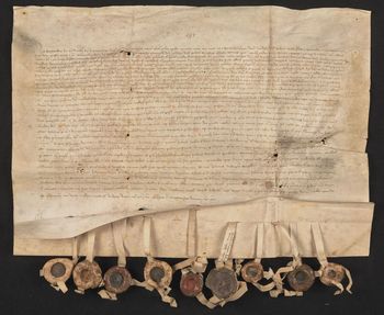 Z czternastu pieczęci zawieszonych na pergaminowych paskach zostało dziewięć [baronów węgierskich], po jednej pieczęci pozostał pasek, po czterech nacięcia w pergaminie.