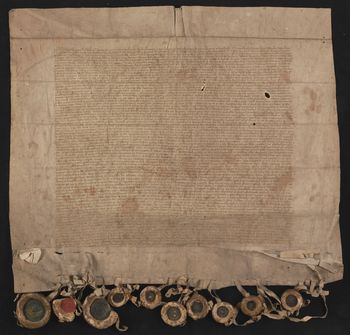 Z 56 pieczęci zawieszonych na pergaminowych paskach pozostało dziesięć: miasta Poznania i Inowrocławia, Jana Rzeszowskiego arcybiskupa elekta halickiego, Paszka z Gogolewa z herbem Doliwa i pieczęć z herbem Korab; pozostałe pieczęcie [herbowe] zatarte; paski pergaminowe po dziesięciu pieczęciach i nacięcia po 36.