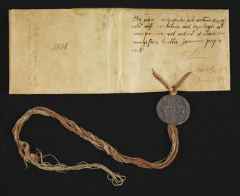 Bulla ołowiana papieża Jana XXIII zawieszona na różowo-złotych niciach.