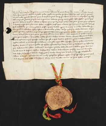 Pieczęć księcia Janusza I zawieszona na zielono-czerwonych niciach [uszkodzona] (Fr. Piekosiński, Pieczęcie, nr 523).