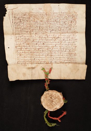 Pieczęć księcia Janusza I zawieszona na czerwono-zielonym sznurku (Fr. Piekosiński, Pieczęcie, nr 523).
