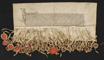 Z 59 pieczęci zawieszonych na pergaminowych paskach pozostało: 36 pieczęci, 20 pasków i trzy nacięcia.