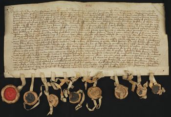 Z dwunastu pieczęci zawieszonych na paskach pergaminowych pozostało: pieczęć księcia oświęcimskiego i zatorskiego Wacława; trzy pieczęcie uszkodzone; fragmenty czterech pieczęci; paski pergaminowe po czterech pieczęciach.