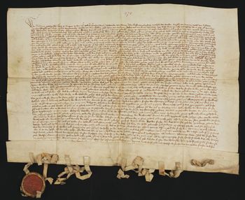 Pieczęć księcia opawsko-raciborskiego Mikołaja zawieszona na pergaminowym pasku, osiem pasków pergaminowych po pieczęciach oraz jedno nacięcie w pergaminie po pasku od pieczęci.