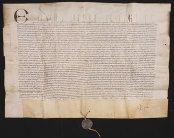 Bulla papieża Eugeniusza IV zawieszona na konopnym sznurku.