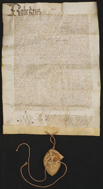 Resztki wykruszonej pieczęci biskupa Roberta, zawieszonej na konopnym sznurku.