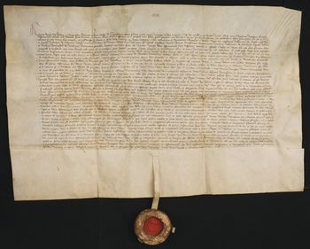 Pieczęć średnia króla Kazimierza Jagiellończyka zawieszona na pasku pergaminowym (M. Gumowski, Pieczęcie królów, nr 29).