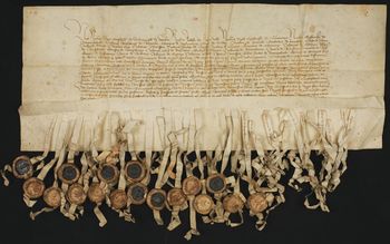 1 rząd piecz.1-27: 1. Mikołaj zwany Marszałkiem z Dębowca albo z Dwieboża / Grünhagen, Markgraf: Mikołaj zw. Marszałek z Dubowca albo Dwie Kozy /. P. herbowa, okrągła, w zielonym wosku w misce z naturalnego wosku, zawieszona na pasku perg., na pasku napis: nicolaus marschalek. 25 mm, miska 37 mm. Legenda źle czytelna: s ianczoi / [...]. /wg Grünhagen, Markgraf: S JANKOW... ZE... A... / W polu pieczęci w czterołukowej podłużnej ramce u dołu mała tarcza z h. Kornic, nad tarczą ukoronowany hełm z labrami, wyżej w klejnocie jakby ukośnie wąska tarcza ? Zob. Grünhagen, Markgraf, II s. 601-602 nr 24 (piecz.1). 2. może Mikołaj Rudzki ze Starej Wsi /Grünhagen, Markgraf: Antiqua Villa/. P. herbowa, okrągła, w naturalnym wosku w misce z naturalnego wosku, zawieszona na pasku perg. 21 mm, miska 35 mm. Legenda raczej zatarta, zapewne: + s nic[...] [...]. W polu pieczęci tarcza z h. Kopacz. Zob. Grünhagen, Markgraf, II s. 601-602 nr 24 (z h. Kopacz także piecz.3, 5, 6, 9, 15, 17, 18, 20, 22, 23, legendy nieczytelne). Z h. Kopacz 11 piecz. 3. Mikołaj Myszkowski. P. herbowa, okrągła, w zielonym wosku w misce z naturalnego wosku, zawieszona na pasku perg. 21 mm, miska 35 mm. Legenda na banderoli, wg Grünhagen, Markgraf: s nicolai / de mis / kowicze. W polu pieczęci tarcza z h. Jastrzębiec. Zob. Grünhagen, Markgraf, II s. 601-602 nr 24 (piecz.4); http://myszkowscy.pl/r1.html [dostęp 16 III 2015]. /4. NN h. Kopacz. P. herbowa, okrągła, w naturalnym wosku w misce z naturalnego wosku, zawieszona na pasku perg. 21 mm, miska 34 mm. Legenda raczej zatarta, zapewne: + [...] [...]. W polu pieczęci tarcza z h. Kopacz. Zob. jak piecz.2. 5. NN. P. brak, pasek perg. 6. NN. P. herbowa, okrągła, w zielonym wosku w misce z naturalnego wosku, zawieszona na pasku perg. 21 mm, miska 35 mm. Legenda: źle czytelna. W polu pieczęci tarcza z h. Kornic. Zob. Grünhagen, Markgraf, II s.601-602 nr 24 (piecz.6 oraz piecz.21, która nie pasuje, może jej brak). 7. Ota z Żebracza/Skubracza#. P. herbowa, okrągła, w zielonym wosku w misce z naturalnego wosku, zawieszona na pasku perg. 21 mm, miska 35 mm. Legenda: sigillu(m) otha... /wg Grünhagen, Markgraf: SIGILLVm + OTHA + Z SZVBZACZA (Scubracz) W polu pieczęci tarcza z głową wołu (podobny do h. Bawola Głowa lub h. Wieniawa). Zob. Grünhagen, Markgraf, II s.601-602 nr 24 (piecz.10). 8. NN. P. brak, pasek perg. 9. Mikołaj z Rajska. P. herbowa, okrągła, w zielonym wosku w misce z naturalnego wosku, zawieszona na pasku perg. 21 mm, miska 36 mm. Legenda: s micolai de raysko. W polu pieczęci tarcza z siedzącym na małym pagórku ? krukiem. Zob. Grünhagen, Markgraf, II s.601-602 nr 24 (piecz.12, ten sam h. w piecz.13 - zapewne tej brak). 10. NN. P. herbowa, okrągła, w zielonym wosku w misce z naturalnego wosku, zawieszona na pasku perg. 21 mm, miska 36 mm. Legenda częściowo zatarta: s [...]lai de [...]. W polu pieczęci tarcza z zatartym h. 11. NN h. Kopacz. P. herbowa, okrągła, w naturalnym wosku w misce z naturalnego wosku, zawieszona na pasku perg. 21 mm, miska 32 mm. Legenda raczej zatarta: + [...] [...]. W polu pieczęci tarcza z h. Kopacz. Zob. jak piecz.2. 12. NN. P. brak, pasek perg. 13. NN h. Kopacz. P. herbowa, okrągła, w naturalnym wosku w misce z naturalnego wosku, zawieszona na pasku perg. 21 mm, miska 33 mm. Legenda raczej zatarta: + [...] [...]. W polu pieczęci tarcza z h. Kopacz. Zob. jak piecz.2. 14. NN. P. brak, nacięcie na pasek. 15. NN h. Kopacz. P. herbowa, okrągła, w zielonym wosku w misce z naturalnego wosku, zawieszona na pasku perg. 21 mm, miska 33 mm. Legenda nieco zatarta: + [...] [...]. W polu pieczęci tarcza z h. Kopacz. Zob. jak piecz.2. 16. NN h. Kopacz. P. herbowa, okrągła, nieco uszkodzona w naturalnym wosku w uszkodzonej misce z naturalnego wosku, zawieszona na pasku perg. 21 mm, miska 34 mm. Legenda źle widoczna. W polu pieczęci tarcza z h. Kopacz. Zob. jak piecz.2. 17. Jan z Biertołtowic (dziś Biertowice). P. herbowa, okrągła, uszkodzona w naturalnym wosku w lekko uszkodzonej misce z naturalnego wosku, zawieszona na pasku perg. z napisem: Johannes de [skreślone: buyakow] biertoltowicze. 21 mm, miska 34 mm. Legenda źle widoczna i znacznie zniszczona. W polu pieczęci tarcza z h. Kopacz. Zob. Grünhagen, Markgraf, II s.601-602 nr 24 (piecz.23); Stanko, Dzieje parafii [w:] Osiem wieków s.58 (Biertołtowice, później Biertowice); jak piecz.2. 18. NN. P. brak, nacięcie na pasek. 19. Jerzy z Pisarzowic. P. brak, pasek perg. z napisem: Georgius de pisarzowicze. Zob. Grünhagen, Markgraf, II s.601-602 nr 24 (piecz.26). 20. NN. P. brak, pasek perg. 21. Jan z Nidka. P. brak, pasek perg. z napisem: [io]annes de Nidek. Zob. Grünhagen, Markgraf, II s.601-602 nr 24 (piecz.29). 22. Piotr z Polanki. P. brak, pasek perg. z napisem: Petrus de polanka. Zob. Grünhagen, Markgraf, II s.601-602 nr 24 (piecz.30). 23. Janusz z Polanki. P. brak, pasek perg. Zob. Grünhagen, Markgraf, II s.601-602 nr 24 (piecz.31). 24. Eliasz z Polanki. P. brak, pasek perg. z napisem: helias de polanka. Zob. Grünhagen, Markgraf II s.601-602 nr 24 (piecz.32). /w dok. jeszcze jego krewny Jan/ 25. NN. P. brak, nacięcie na pasek. 26. Oświęcim miasto. P. brak, pasek perg. z napisem: Oswyanczim. Zob. Grünhagen, Markgraf, II s. 601-602 nr 24 (piecz.35). 27. Kęty miasto. P. brak, pasek perg. z napisem: Opidum kanthy. Zob. Grünhagen, Markgraf, II s. 601-602 nr 24 (piecz.36).