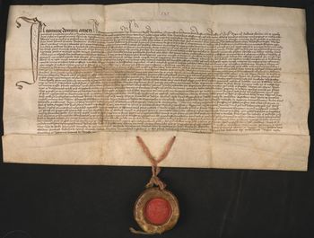 Pieczęć średnia króla Kazimierza Jagiellończyka zawieszona na różowych niciach (M. Gumowski, Pieczęcie królów, nr 27).