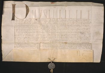 Bulla ołowiana papieża Piusa II zawieszona na konopnym sznurku.