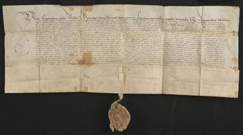 Pieczęć owalna [zatarta, widoczne tylko zarysy postaci biskupiej] zawieszona na pergaminowym pasku.