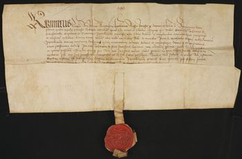 Pieczęć króla Kazimierza Jagiellończyka zawieszona na pergaminowym pasku (M. Gumowski, Pieczęcie królów, nr 27).