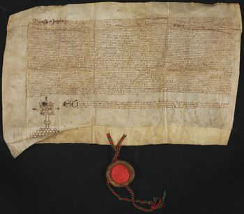 Pieczęć arcybiskupa Jana Wątróbki ze Strzelc zawieszona na czerwono-zielonym jedwabnym sznurku.