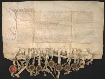 Z 21 pieczęci zawieszonych na pergaminowych paskach pozostało siedem; czternaście pasków pergaminowych; jedna pieczęć luźna.