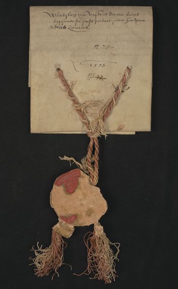 Pieczęć króla Władysława Jagiellończyka zawieszona na różnokolorowym jedwabnym sznurku, całkowicie prawie wykruszona.