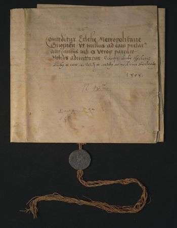 Bulla papieża Juliusza II zawieszona na czerwonym jedwabnym sznurku.