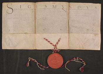 Pieczęć króla Zygmunta III zawieszona na jedwabnym biało-czerwonym sznurku (Gumowski, Pieczecie nr 75).