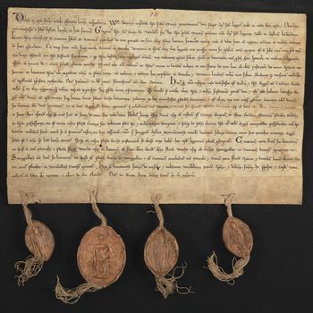 Pieczęcie zawieszone na lnianych niciach: biskupa Ozylii [Henryka], biskupa dorpackiego [Hermanna, nie Jannusa]; biskupa niegdyś Modeny Wilhelma; prepozyta semigalskiego Henryka Belda.