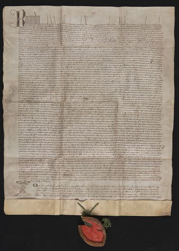 Dokument sporządzony przez Jana syna Aubrieti de Mandris kleryka diecezji lingoneńskiej, notariusza publicznego.