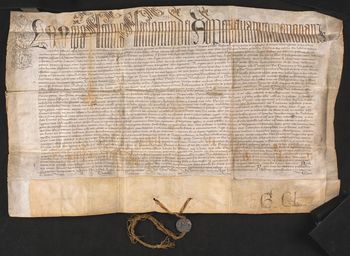 Pieczęć papieża Leona X zawieszona na żółto-czerwonym sznurku.