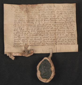 Z dwóch pieczęci zawieszonych na pergaminowych paskach pozostała jedna z wykruszonym otokiem.