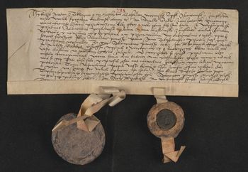Z 2 pieczęci zawieszonych na pergaminowych paskach została jedna z herbem Ostoja [zatarta], po drugiej została tylko miska.