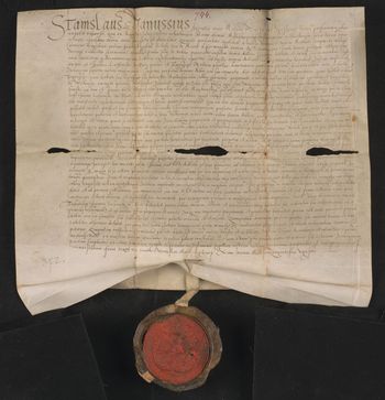 Pieczęć książąt Stanisława i Janusza III zawieszona na pergaminowym pasku.