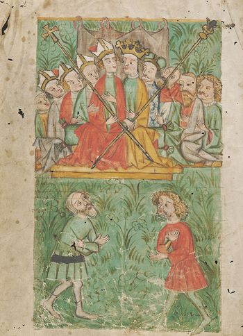 Kodeks Świętosława z Wojcieszyna. - Mazowsze, 1448-1450. - 58 kart (116 stron) + [2] karty ochronne : pergamin, pismo jednej ręki, ilustracje iluminowane, Dekoracja malarska: iluminator z terenu Mazowsza ?, 2 miniatury całostronnicowe i 6 inicjałów malarskich ; 31,5 x 24,5 cm.
