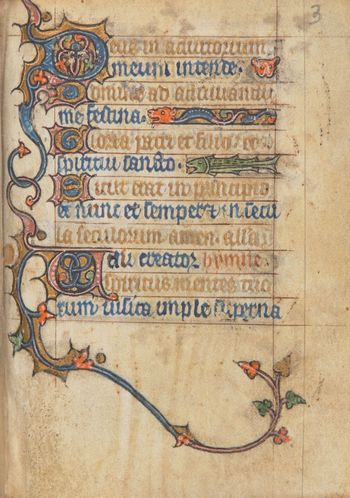 Livre d'Heures. - Francja północna, [około 1 ćw. XIV w.]. - 120 kart +6 kart : pergamin, ilustracje iluminowane 4 miniatury, inicjały malarskie, drolerie ; 8 x 6 cm.