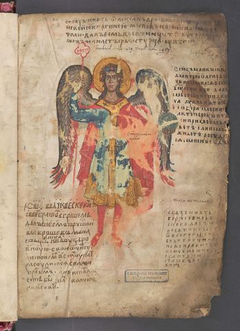 Ewangeliarz, tzw. Ławryszewski [Aprakos pełny]. - Ruś południowa, [koniec 13-14 w.]. - 183 karty : pergamin ; pismo: ustaw kaligraficzny (typowy od XII do XIV w.), półustaw, skoropis; iluminacje, 18 miniatur w większości rysunkowych ; 31 x 22 cm.